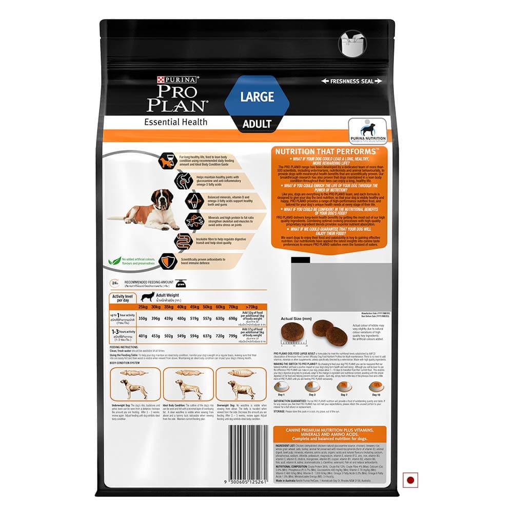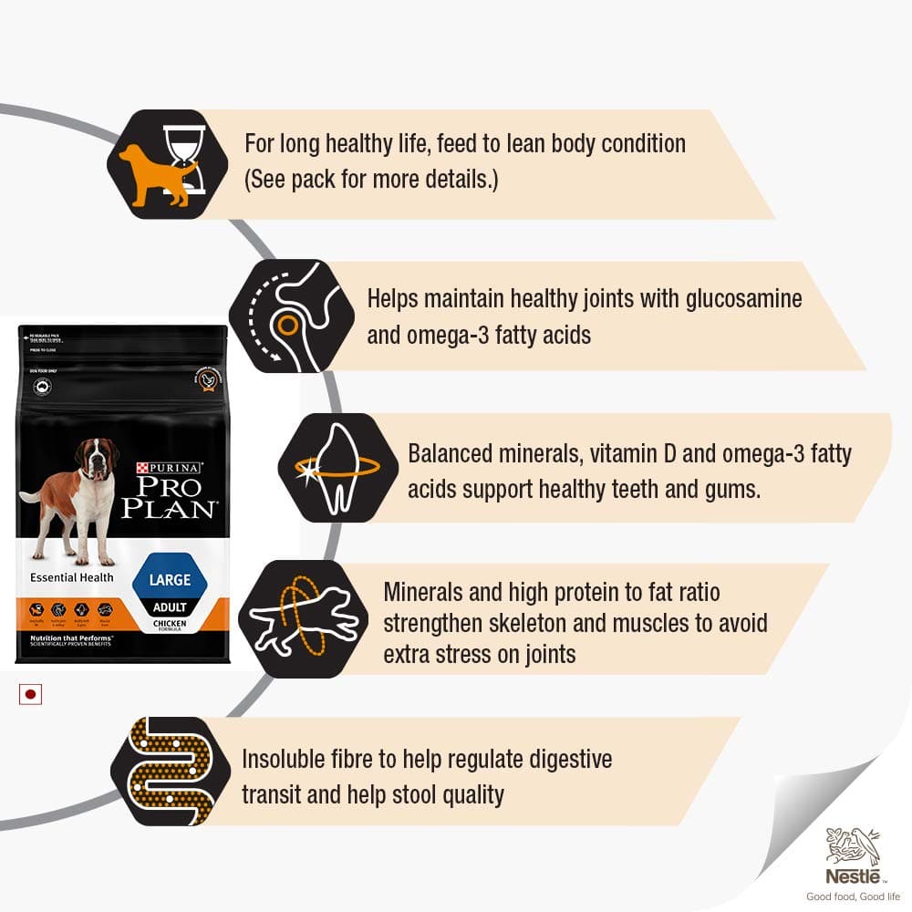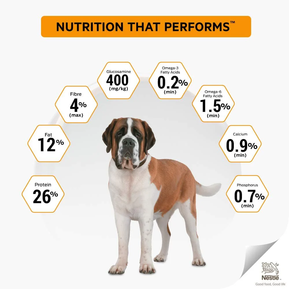 PURINA PRO PLAN Dry Dog Food by Nestlé offers complete and balanced nutrition, carefully developed by a team of over 500 veterinarians, nutritionists, and animal behaviorists. Specifically designed for large breed adult dogs, this premium dog food caters to their unique health needs, delivering tailored high-performance nutrition for every stage of life.