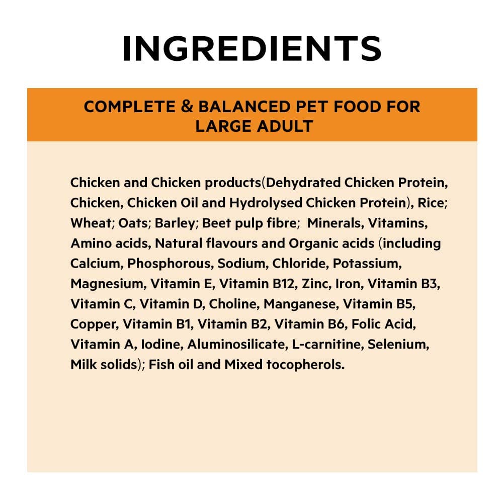 Dehydrated chicken (a natural glucosamine source); brewers rice; whole grain wheat; oats; barley; animal fat preserved with mixed tocopherols (a form of vitamin E); animal digest; beet pulp; minerals; vitamins; amino acids; organic acids; natural flavors (including calcium, phosphorus, sodium, chloride, potassium, magnesium, vitamin E, vitamin B12, zinc, iron, vitamin B3, vitamin C, vitamin D, choline, manganese, vitamin B5, copper, vitamin B1, vitamin B2, vitamin B6, folic acid, vitamin A, iodine, aluminosilicate, L-carnitine, selenium); fish oils; and natural antioxidants. Choose PURINA PRO PLAN Large Breed Dog Food today and support your dog’s overall health and happiness!